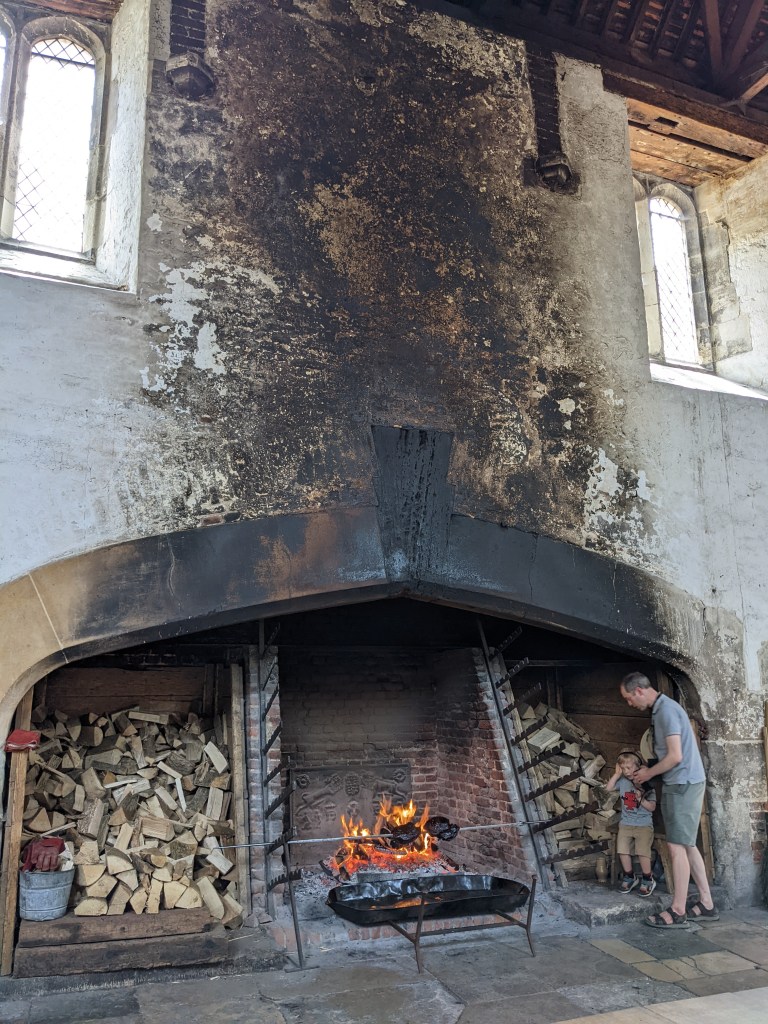 The front gates of the palace (with tourists). Author’s photo.The inner gates of the palace (and more tourists). Author’s photo.The steps up to Henry’s rooms. Author’s photo.The Great Hall, where feasts and parties would happen. Notice all the deer antlers around the walls and the rich tapestries. Author’s photo.The beautiful ceiling of the Great Hall. This room was meant to show how rich ad powerful the king was. Author’s photo.The king’s table, not the real one, in the Great Hall. Author’s photo.The smaller chamber where the king would receive guests. This is where I imagined Tommy and Nick meeting the king. Author’s photo.Portrait of Henry VIII. Author’s photo.The Haunted Corridor, where Katherine Howard’s ghost makes frequent appearances. There were only tourists the day I was there. Most disappointing. Author’s photo.The palace kitchens that are still used today. The roasting chickens look rather small in that huge fireplace, don’t they? Author’s photo.Visitors sometimes get to help out turning the spit. This would be a hot job! Author’s photo.More small fireplaces and places to prepare food for hundreds of royal banquet guests. Author’s photo.One more look at this majestic palace through a field of wildflowers. Author’s photo.
